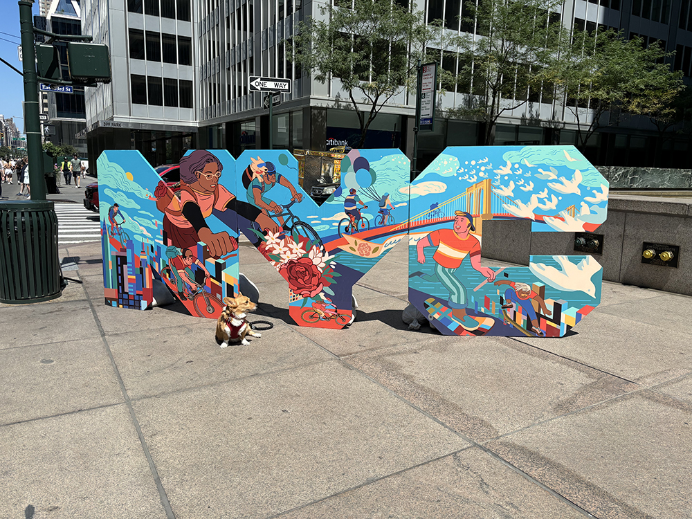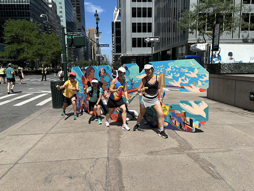 The designs are inspired by the vibrant summer energy of New York City. Joggers, cyclists, and animal companions fill the streets, moving to the rhythm of music and dance that reflect the city’s cultural diversity. Inside the irregular shape of “NYC,” figures appear in different perspectives, connected by sweeping arcs that symbolize the city’s bridges—just as people from all over the world come together here each day.